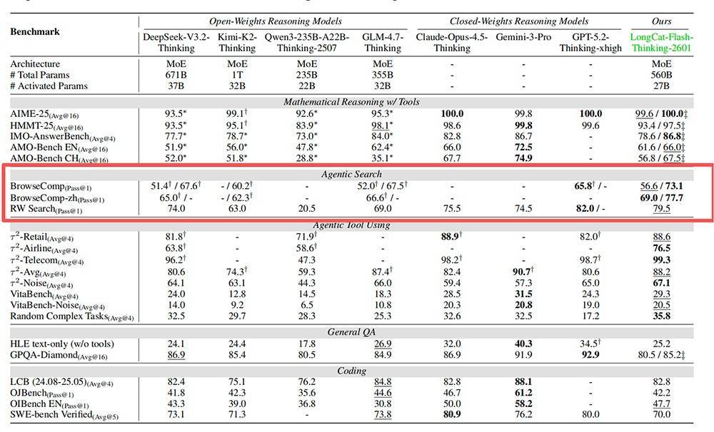 (1)智能体搜索能力卓越:在权威评测BrowseComp(加上下文管理)中达到73.1分,性能已逼近顶级闭源模型,具备行业领先的复杂任务决策与推理能力。