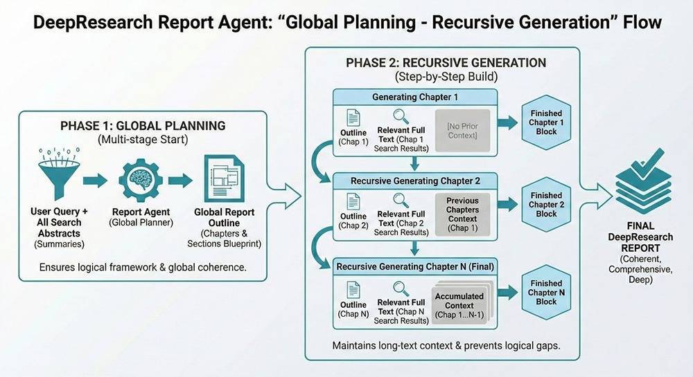 (1)“全局规划-递归生成”的长文构建机制:采用multi-stage渐进式生成架构,先基于全网搜索摘要生成全局“报告大纲”,确保逻辑框架的严密性;随后通过“递归生成”(Recursive Generation)策略,将当前章节大纲、相关搜索文档与前序章节上下文联合输入,逐章撰写。