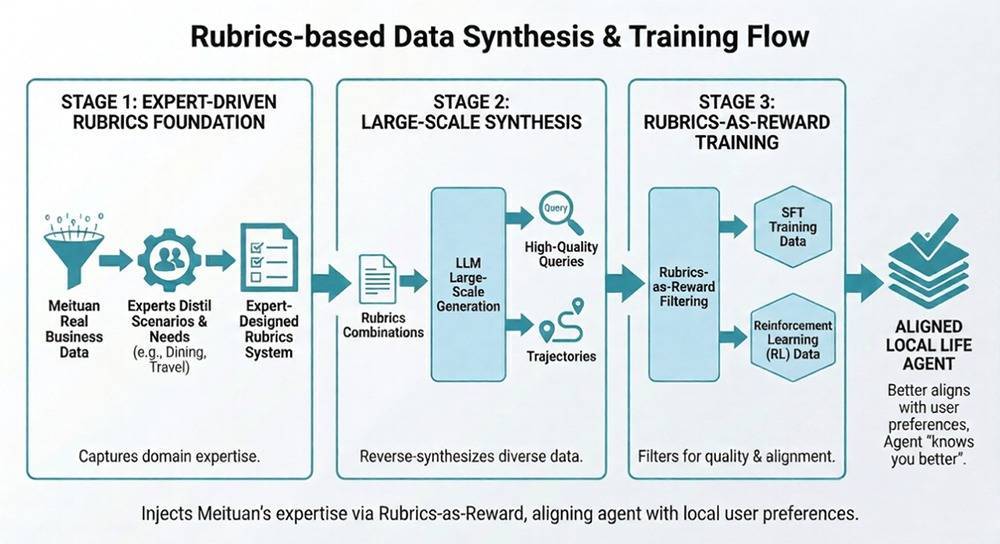 (2)基于Rubrics的高质量数据合成:由专家依据美团本地生活真实业务数据提炼餐厅推荐、旅行规划等场景及需求点,整合为系统的Rubrics(评价准则)体系,再通过LLM生成具体Rubrics组合,反向合成高质量Query与Trajectory,最终以Rubrics-as-Reward筛选Trajectory用于SFT与强化训练。