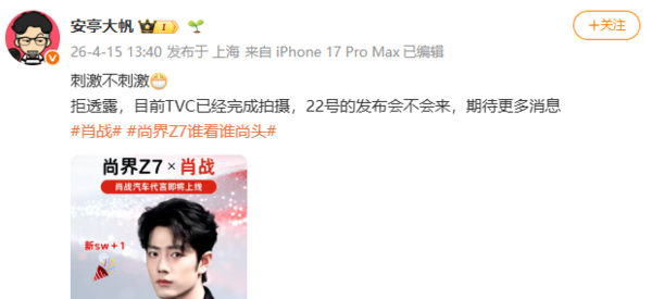 【CNMO科技消息】据CNMO了解,汽车博主“安亭大帆”近日发布一张海报配资炒股给股票,画面包含“尚界Z7×肖战 肖战汽车代言即将上线”字样,并配有肖战和尚界Z7车型图片。该博主称相关TVC已完成拍摄,但4月22日的发布会肖战不会到场。截至目前,尚界品牌与肖战方面尚未就代言信息作出官方确认。