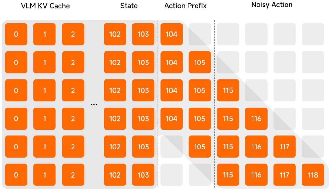 Λ-shape Attention Mask:通过特殊的注意力掩码,强制模型更关注当前的视觉反馈,而不是沉溺于历史惯性。这让机器人在面对环境突发变化时,能够展现出极强的反应性物理智能。