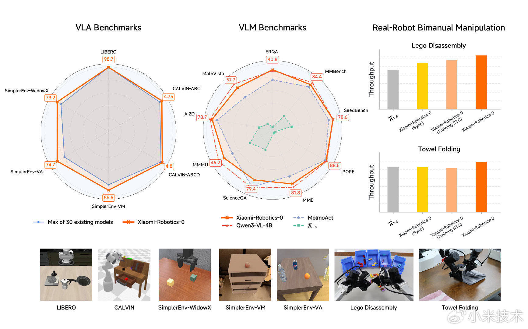 在多维度的测试中,Xiaomi-Robotics-0 展现出优异的表现: