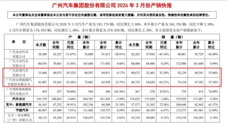 而数据显示,广汽传祺日前公布其一季度销量达到9.2万辆,同比增长33%,其中,MPV家族销量20303辆,2026款传祺M8 HEV累计同比增长51.9%;另一方面的广汽埃安销量达到7.4万辆,同比增长57%;且昊铂埃安BU还额外公布称,终端销量75389辆,同比增长8.72%。